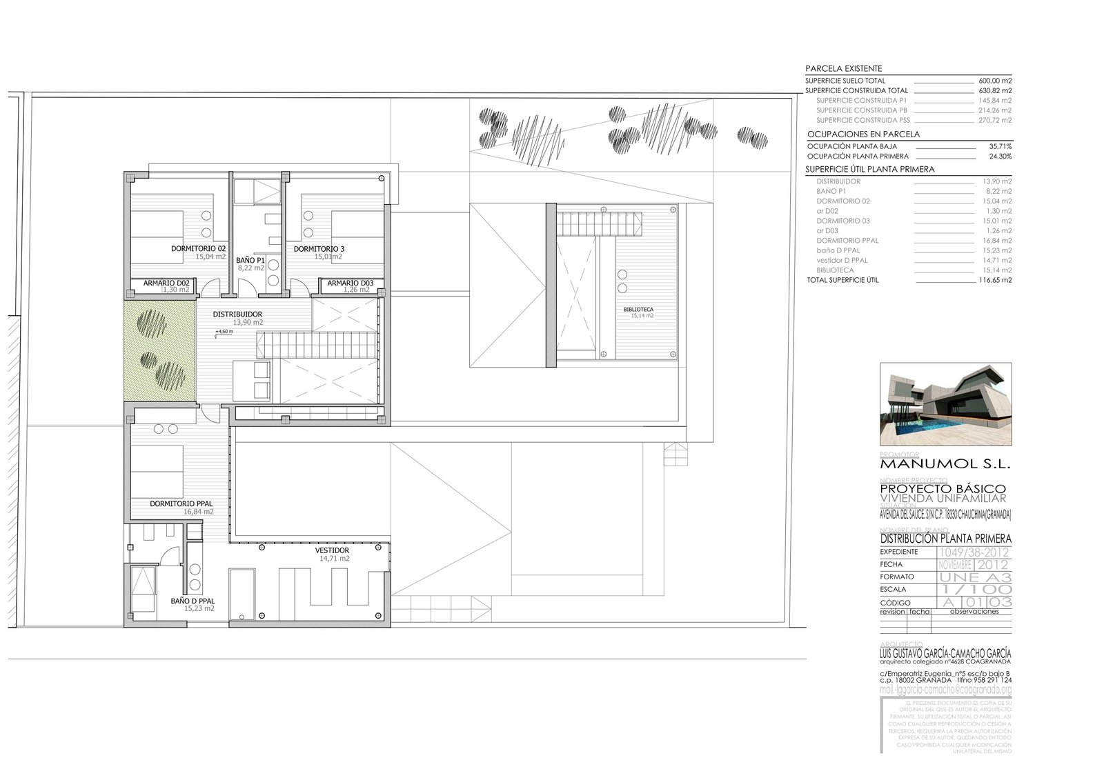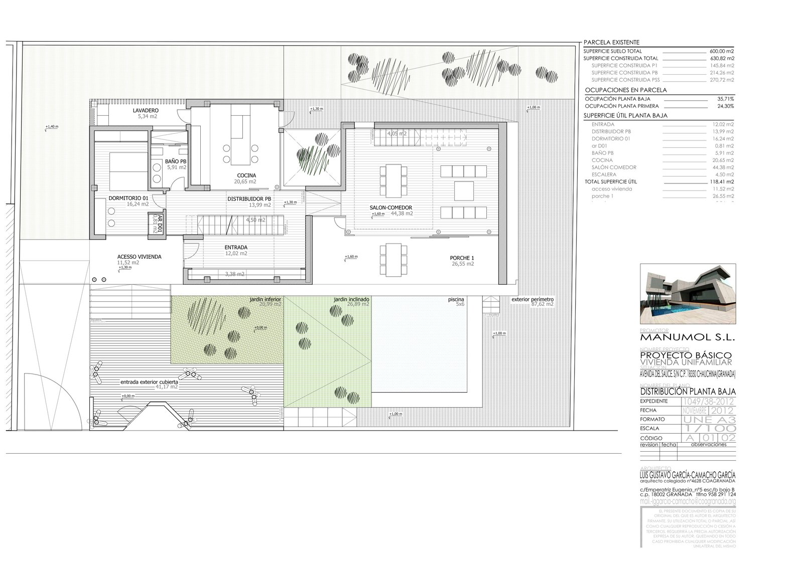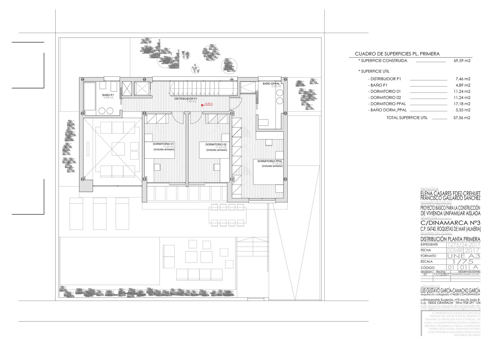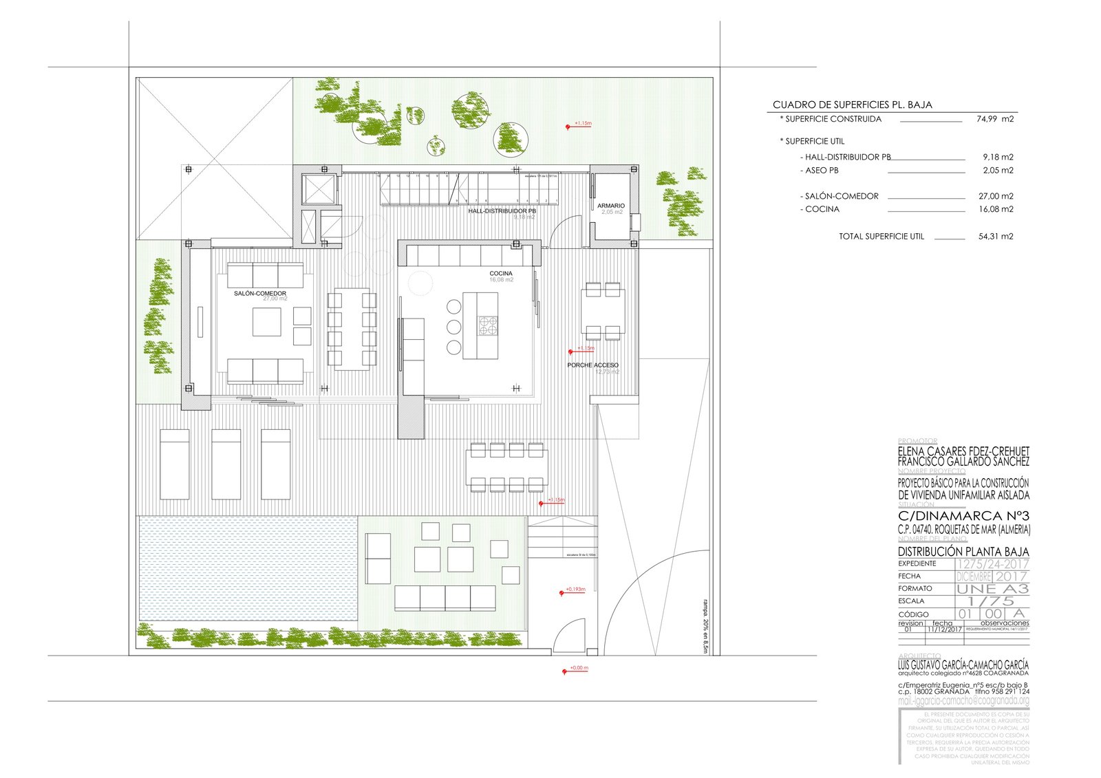 Con dos plantas sobre rasante y una superficie por planta de poco más de 60m2, se decide el aprovechamiento máximo de la parte delantera de la parcela volcando las estancias de salón y cocina a ésta. El acceso a la vivienda se retranquea respecto a la línea de edificación, cualificándose a consta de un distribuidor acristalado con vistas hacia espacio ajardinado a modo de “foto de fondo”.