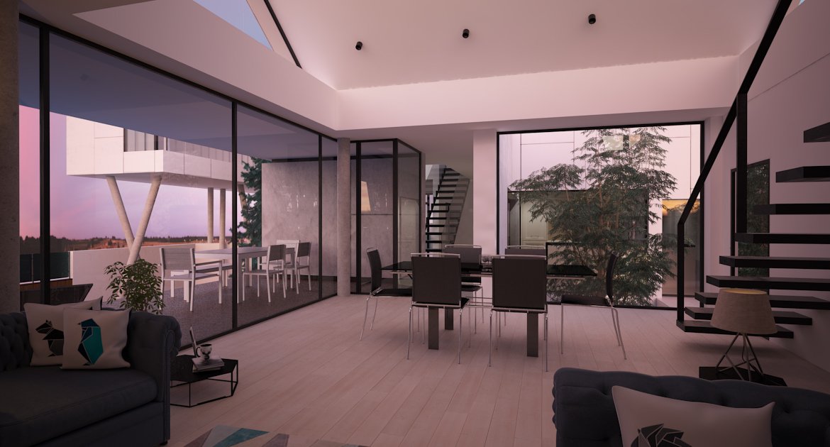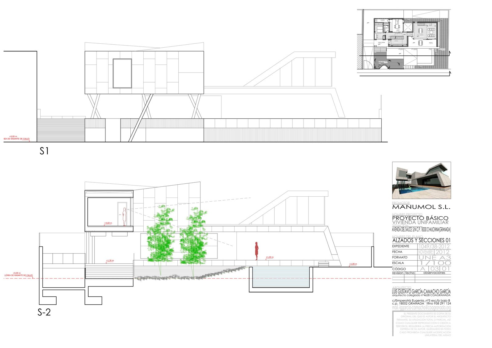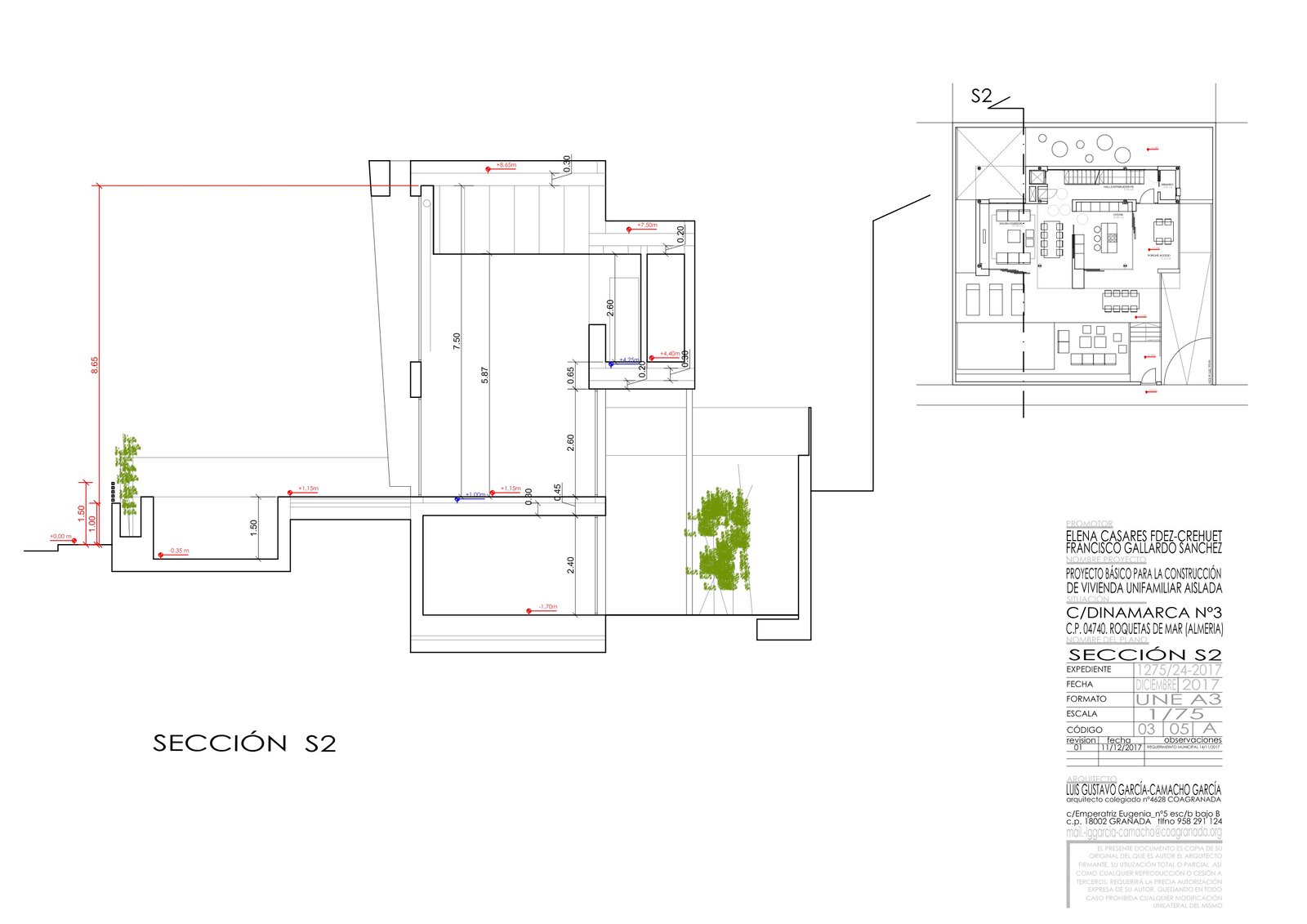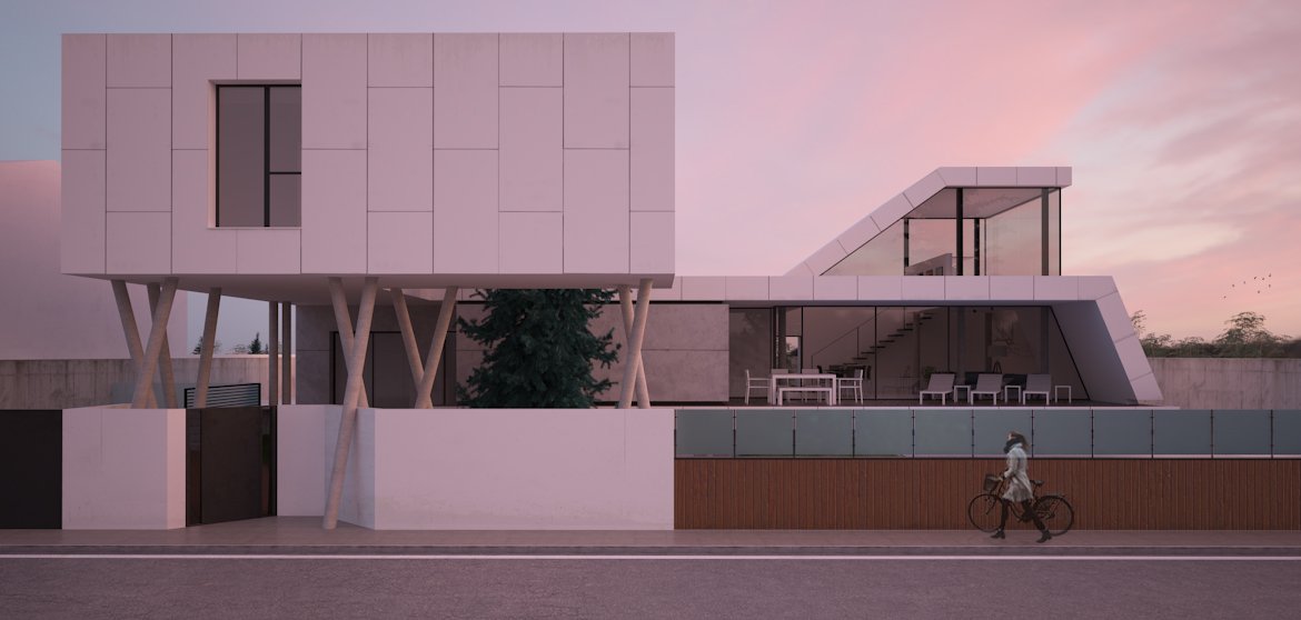 Con dos plantas sobre rasante y una superficie por planta de poco más de 60m2, se decide el aprovechamiento máximo de la parte delantera de la parcela volcando las estancias de salón y cocina a ésta. El acceso a la vivienda se retranquea respecto a la línea de edificación, cualificándose a consta de un distribuidor acristalado con vistas hacia espacio ajardinado a modo de “foto de fondo”.