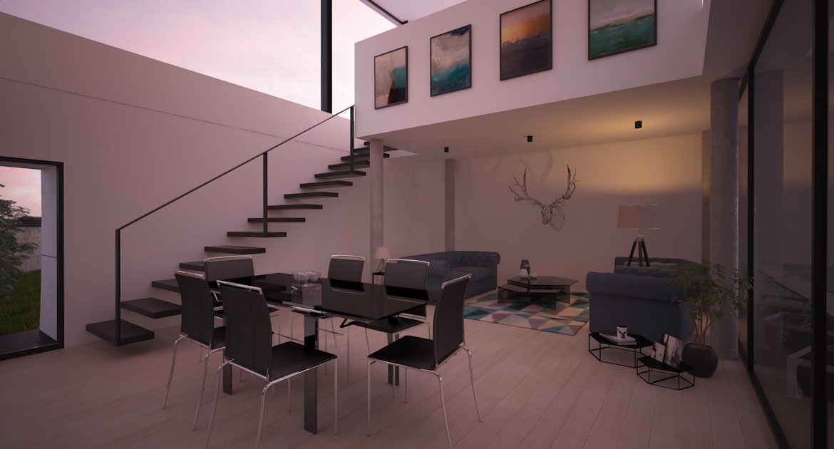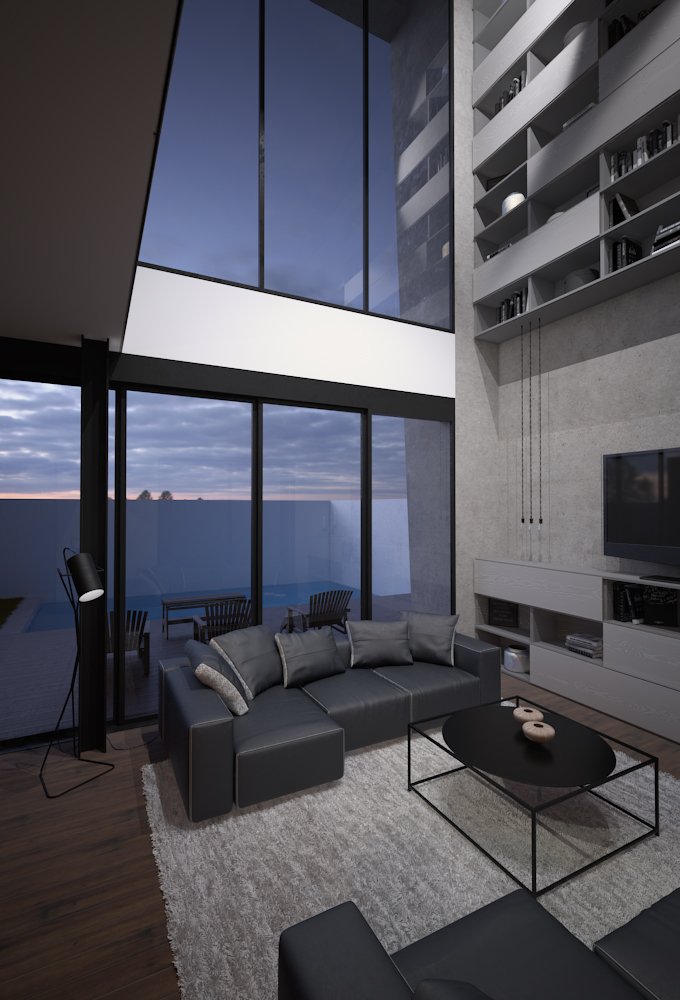 El salón, a doble altura, comunica y amplifica la dimensión de las vivienda.