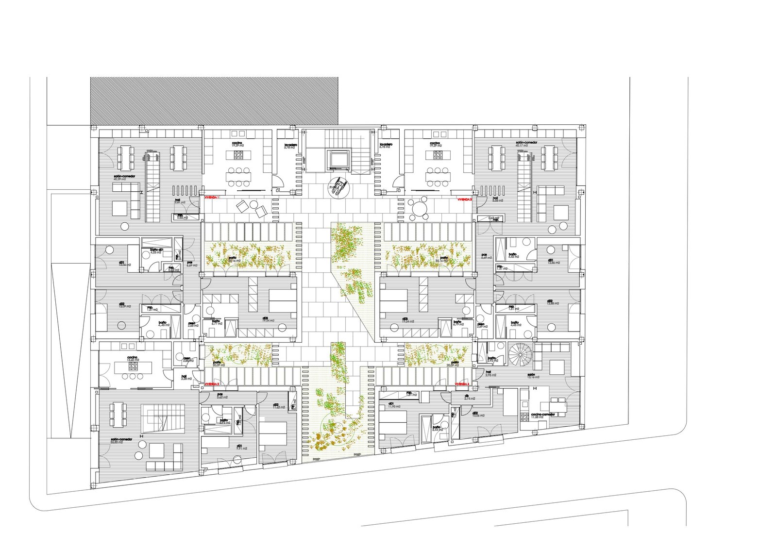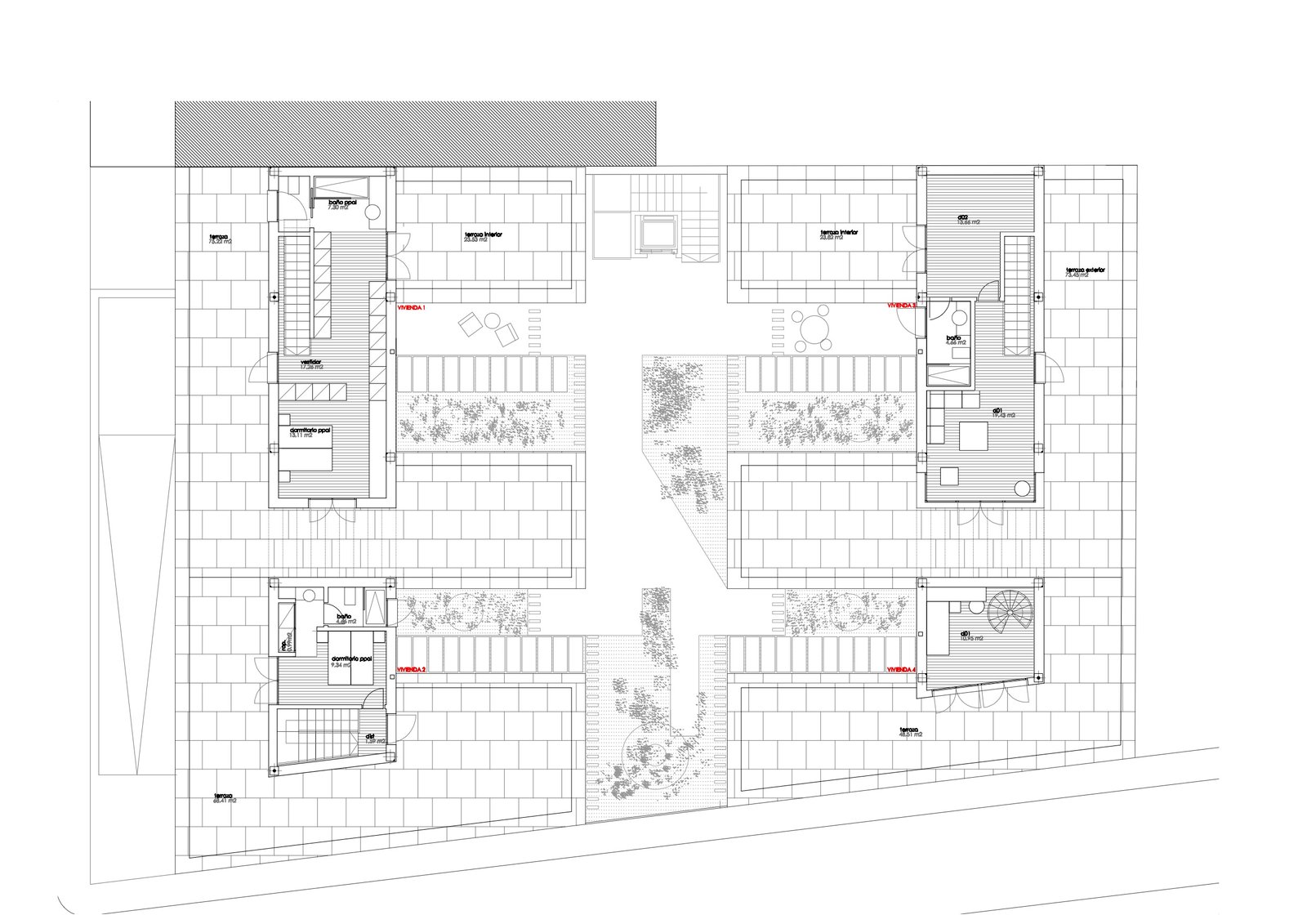 El proyecto se posiciona sobre un solar con poca edificabilidad. Esto motiva la configuración de espacios mixtos interior-exterior, ampliando los primeros a costa de los segundos.