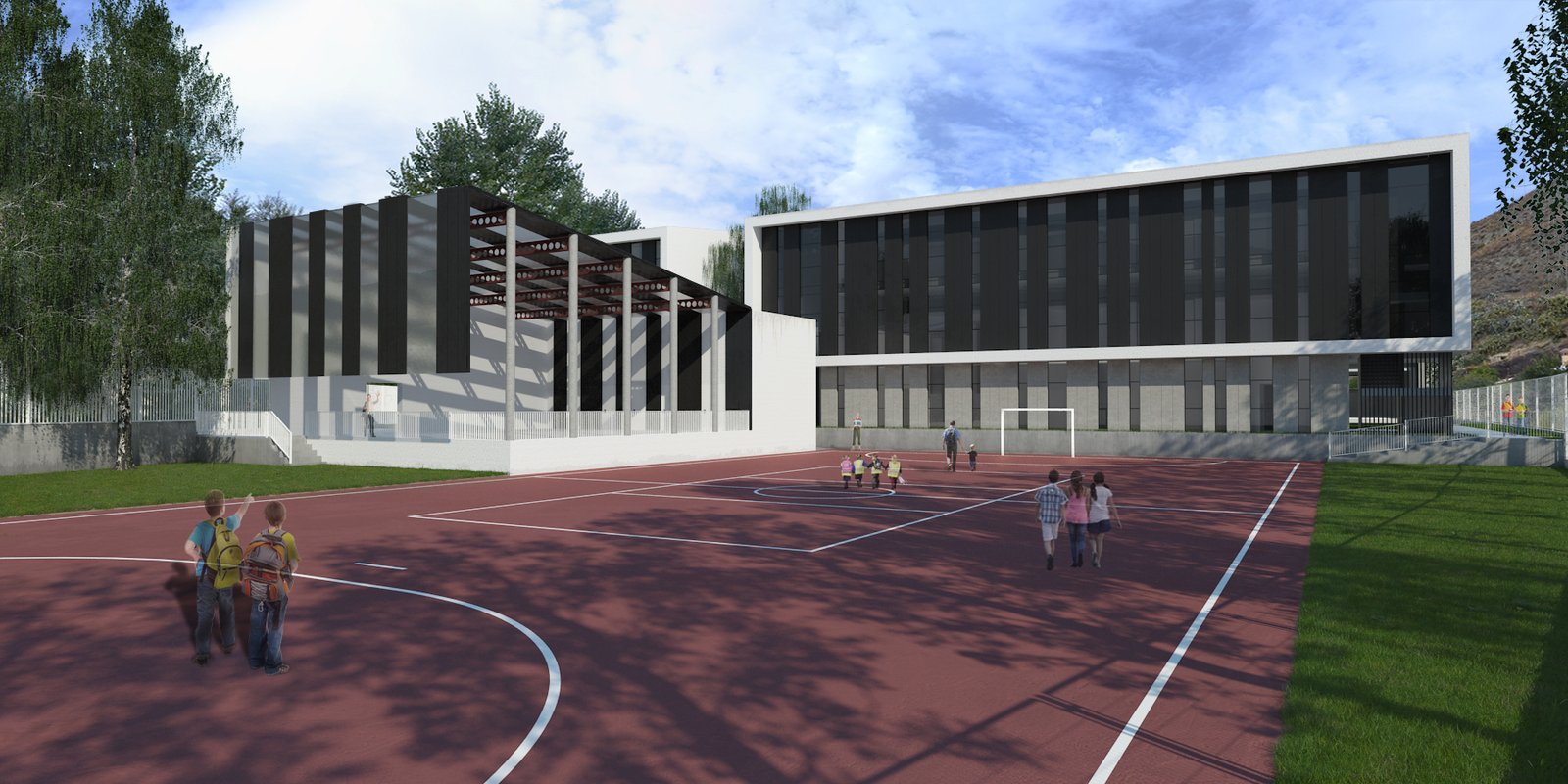 El acceso principal se realiza desde la calle Huenes. Encontramos un espacio de recepción, tamizado y vigilado por el resto de volúmenes, que nos permite subir por una rampa de acceso hasta el patio articulador central, desde donde se da acceso a las distintas zonas que conforman el centro y donde se sitúa el núcleo principal de comunicación vertical (acceso a planta semisótano, planta baja, planta primera y planta segunda). Existirá también un acceso secundario desde el espacio público que se sitúe al sudeste, desde donde se verán las zonas de juego de primaria, la pista polideportiva, el pabellón y la fachada principal.