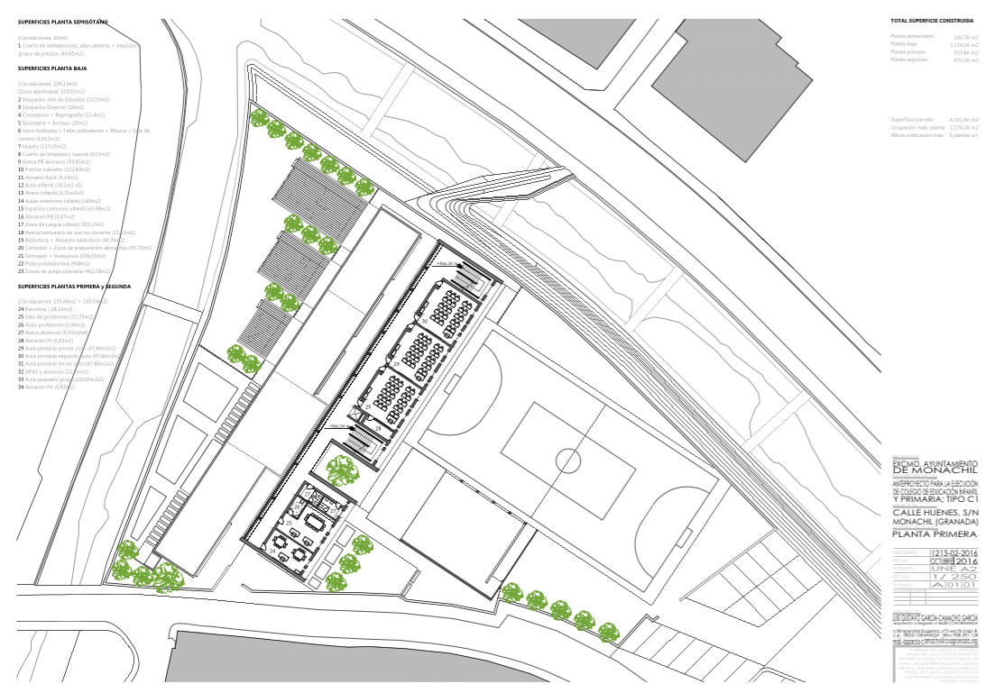 Se reserva un espacio en planta semisótano para colocar las instalaciones. En planta baja se disponen los usos de administración más importantes, las zonas de infantil, biblioteca, comedor, usos múltiples, pabellón, pista polideportiva, patios y todas las zonas de juego. En definitiva, los espacios que por sus características funcionales y formales deben estar ahí. plantas primera y segunda para alojar las aulas de primaria tercer ciclo; recursos y aulas de pequeño grupo), la sala de APAS y alumnos. Todo ello conforme a las superficies indicadas en los cuadros que siguen, de acuerdo con la normativa oficial vigente y ajustándose a los parámetros recomendados en la “Orden de 24 de enero de 2003 de la consejería de educación y ciencia por la que se aprueban las “Normas de diseño y constructivas para los edificios de uso docente”.
